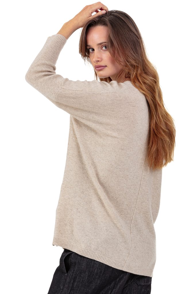 Modern and comfortable, the PIPPA women’s jumper delights with its oversized cut and deep V-neck. Knitted in 100% 2-ply cashmere, it offers a fine, fluid knit. Three-quarter ribbed sleeves and a worked collar detail, inspired by the Varsovie model, add originality and elegance.