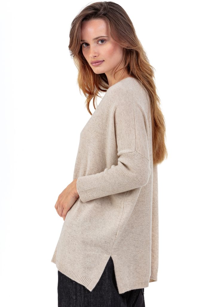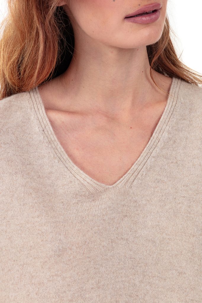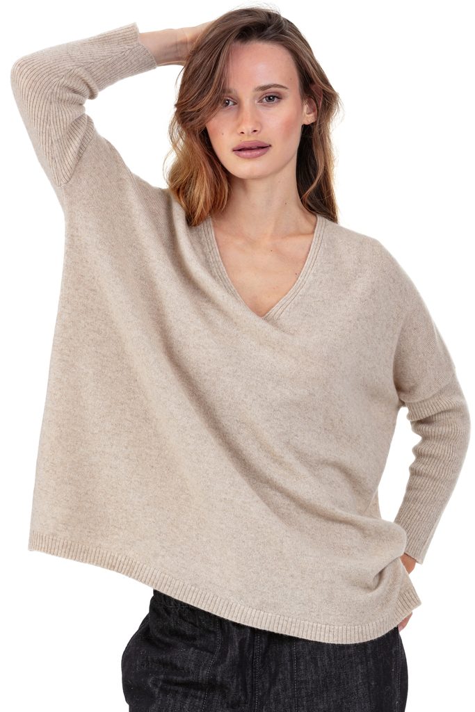 This oversized V-neck cashmere jumper is ideally paired with slim trousers or a pencil skirt to balance the silhouette. A modern and feminine piece, perfect for all your elegant yet relaxed outfits.